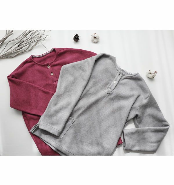 当店では人気の高いVネック、ヘンリーネックの他にもタートルネックなど様々なデザインの中からお選びいただけます。かぶりデザインのパジャマはパジャマ感の少ないデザインが多いのでルームウェアにもお使いいただけます。