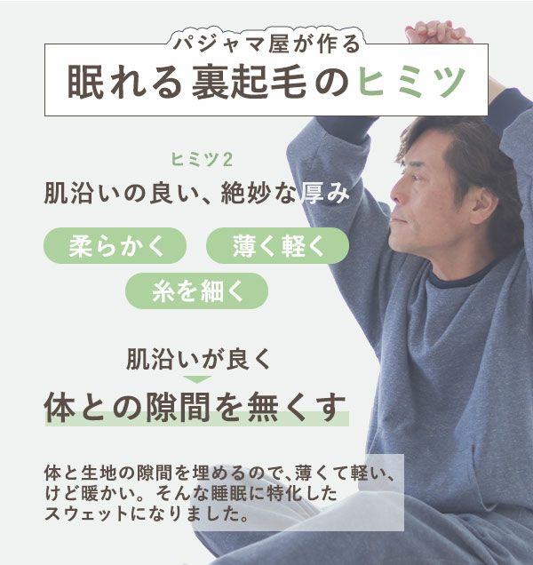 吊り編み機で作られた生地は、糸への負担が少ないため、糸が自ら編まれるような空気を含んだ編み方になります。しかし、吊り編み機では生産効率が悪く、1時間に1mしか編めないことも…。そこで、現代のオーソドックスなシンカー編み機で、吊り編み機のような風合いを出せないかと考え、社長と編み職人が試行錯誤を繰り返しました。パジャマだからこそ”もっと柔らかく、もっと肌に沿い暖かく”を追及した新しい弊社オリジナル生地です。ふわふわ裏起毛が肌に気持ちよく部屋着として最適です。
