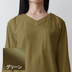 仕様 | 長袖 長ズボン 上下セット /上着:かぶり 襟なし Vネック 左胸ポケット /ズボン:ウエストワッフルゴム入り (肌のデリケートな方向け縫製仕様) |
