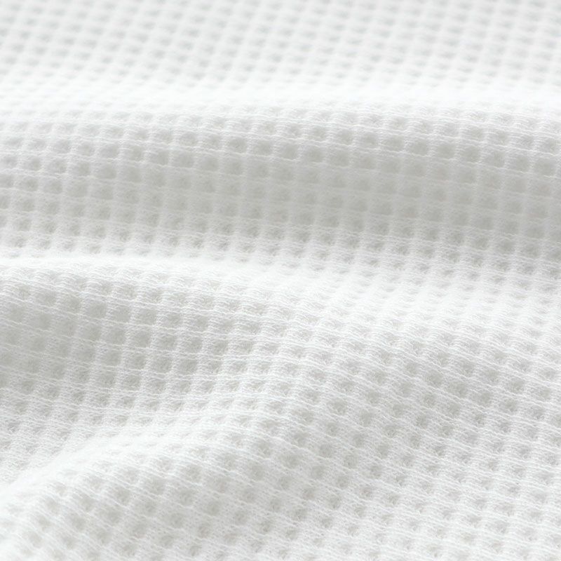 ワッフル調のワッフルフェイスという独特の編み方で表面は凹凸になっており、生地に表情が生まれておしゃれな印象に。肌にあたる方は凹凸がないので、朝起きた時にワッフル調のポコポコが肌に残ることもありません。また、極端に縮みやすい一般的なワッフルに比べ、こちらの生地は縮みにくくなっています。