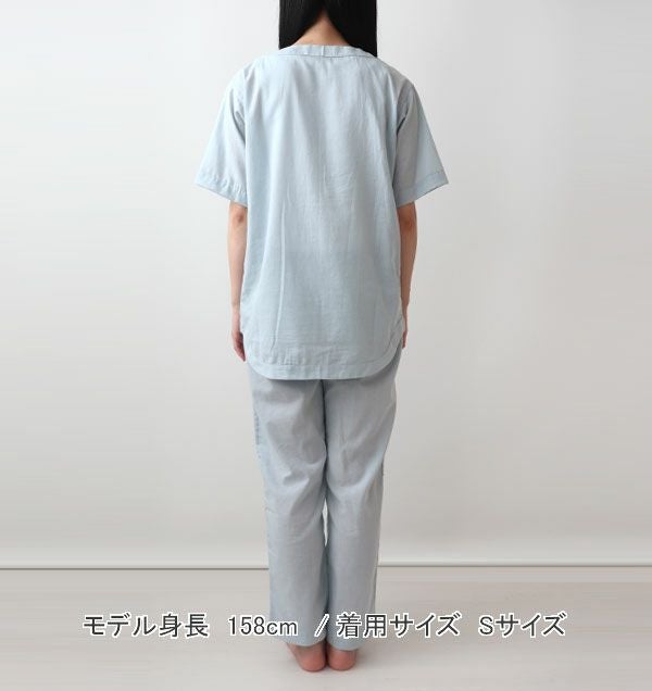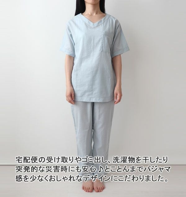 部屋着、ルームウェア感覚で着られるVネックのパジャマのご要望を大変多く頂いておりました。どんな生地でもかぶりやすいサイズ感とVネックの開き具合に大変苦労しました。半袖でより涼しく着たいという方にぴったりなデザインです。