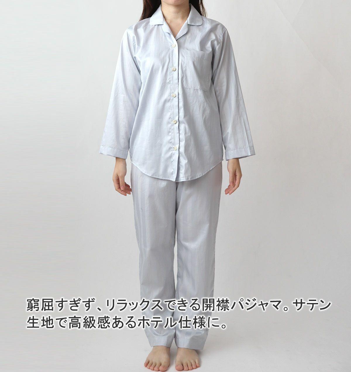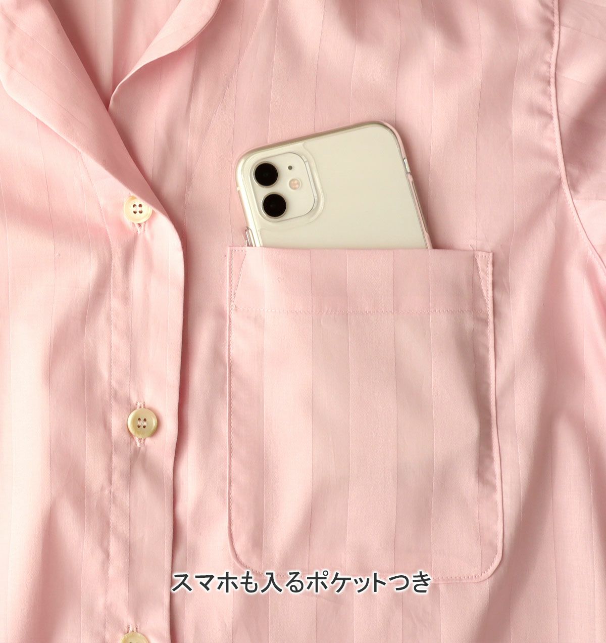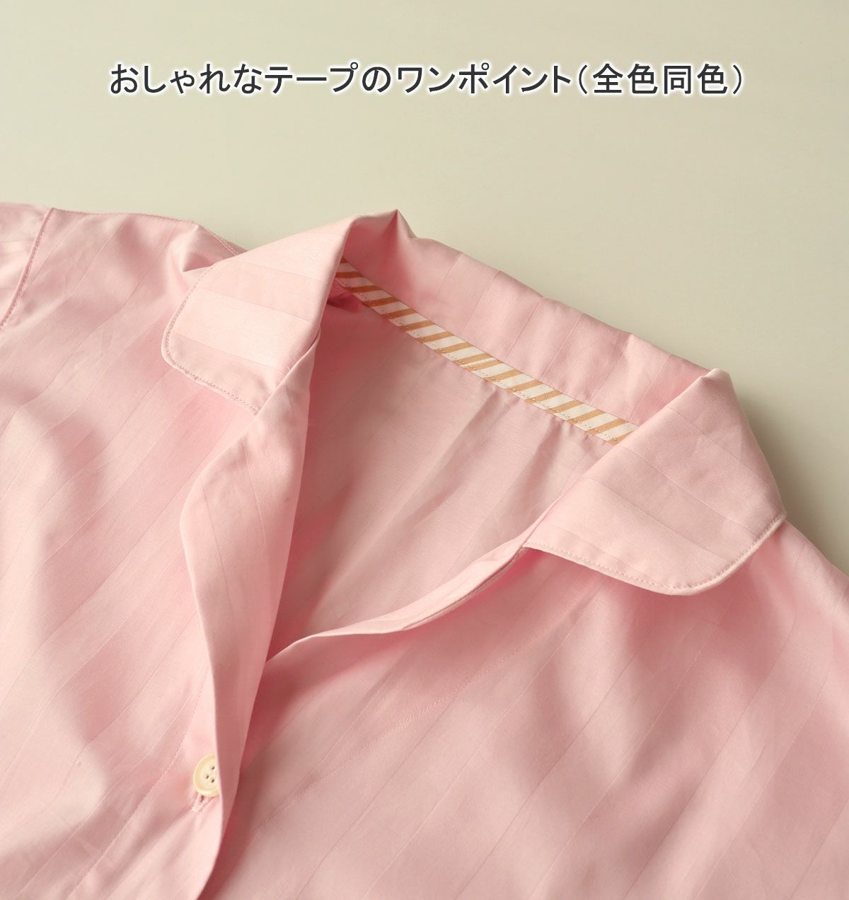いろんなホテルでも採用されているサテンストライプ。ゆったりした首元の開襟デザインで、ホテルに滞在しているようなラグジュアリーなひとときを。