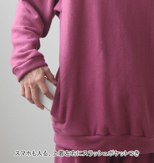 ふわふわ裏起毛スウェットのVネックのパジャマルームウェア。上着単品。レディースXS~5L。真冬でも朝までぽっかぽかのフリースに負けない暖かさに関わらず、綿100%なのでムレずに快適にお過ごしいただけます。袖丈の長さも調整可能。