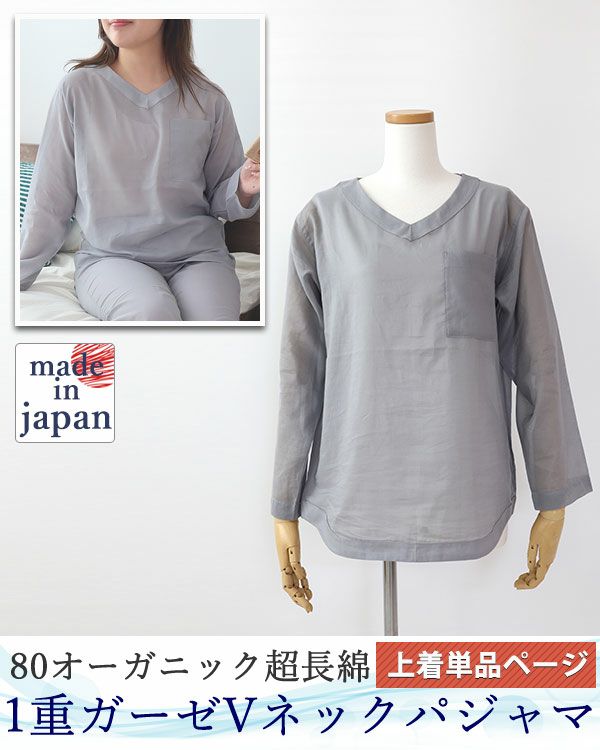 新感覚ガーゼ!柔らかいのにサラサラの肌触り 80オーガニック超長綿1重ガーゼレディースパジャマ上着単品・長袖/かぶり/Vネック【オーダーメイド】