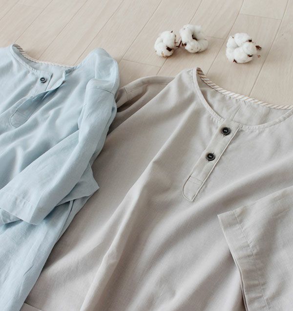 柔らかくて軽い極上のガーゼ生地、オーガニック超長綿ダブルガーゼレディースパジャマをご紹介!従来よりも30%軽量、通気性も抜群でサラッとした着心地♪デザインはおしゃれなヘンリーネックだから部屋着としても着られる一枚になりました!