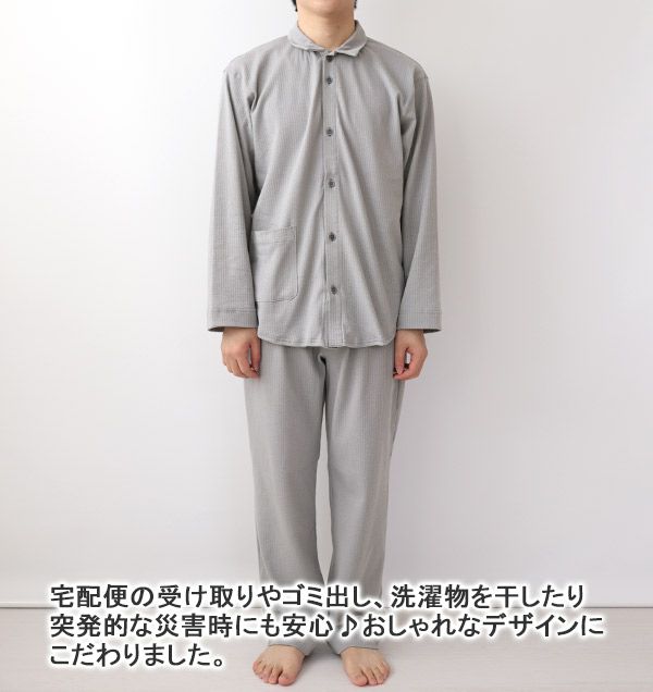オーガニックコットンスムースニットメンズパジャマ上下セット・長袖/前開き/襟あり