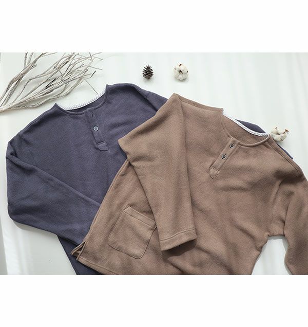 某海外ブランドや国内大手アパレルメーカーなども採用しているコットンパイル。特に海外ブランドは、地球環境を考えたリサイクル・エコ志向が強く、綿100%の素材が好まれています。ポリエステルを使用しているのはループを埋め込むグランド部分のみ、肌に当たる部分は綿100%のタオル地を起毛することで、あたたかいのに蒸れにくく、安心してお休みいただけるカシミヤタッチのパジャマができました。