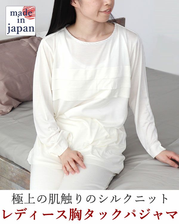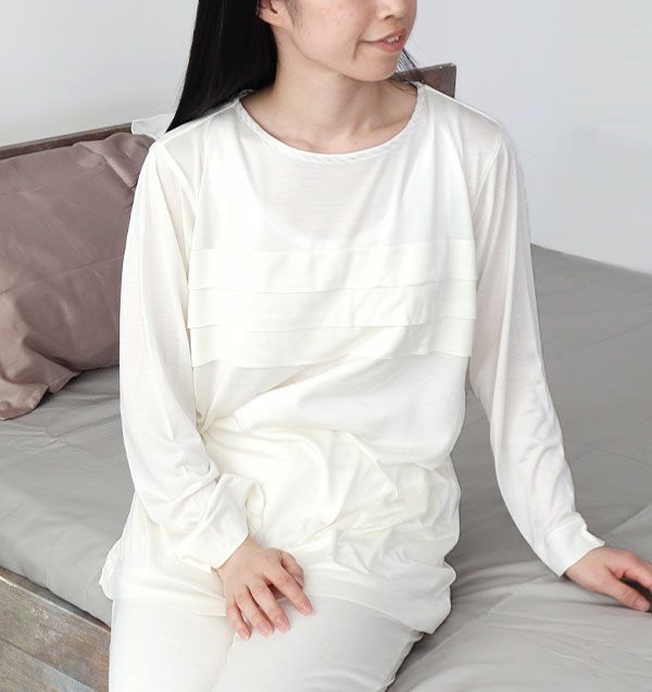 胸元の三段タックは、一枚で着ても胸元が透けない工夫を。パッドがついていないので蒸れることもありません!パジャマとしてだけでなく、ルームウェア・部屋着としてもおすすめです。とろけるような肌ざわりのシルクニット、素肌に一枚で着ていただきたいパジャマです♪
