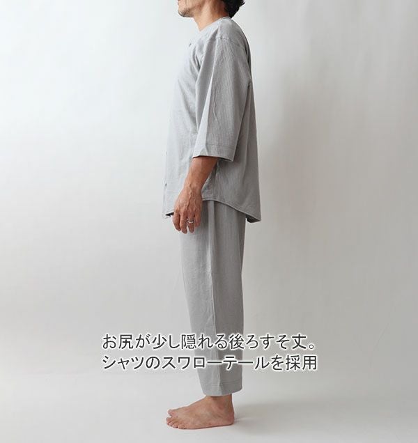まるでシャツのようなニットサッカーは、ズボンだけ、かえればゴミ出しはもちろん外出にも着ていけそうです!涼しい夏のおしゃれなルームウェアとしても。ボタンをはずしただけで全く違う印象に・・・