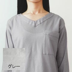 Tシャツとは違う1枚で大人っぽくおしゃれな印象になれるVネックデザイン。かぶりなので、突然の来客でも着脱しやすく部屋着、ルームウェアとしても最適の1枚です。オープン当初から一番ご要望が多かったのですが、首周りのサイズ感やおしゃれなデザインになるよう裾にもこだわり時間を頂きました。