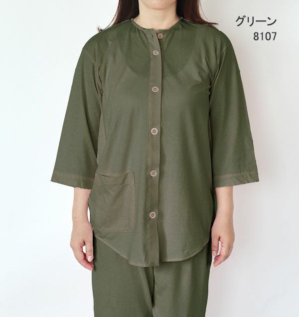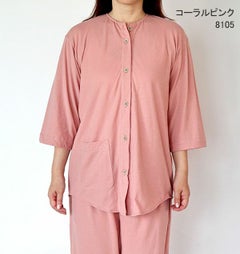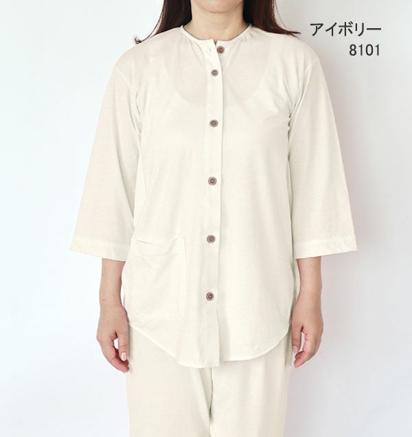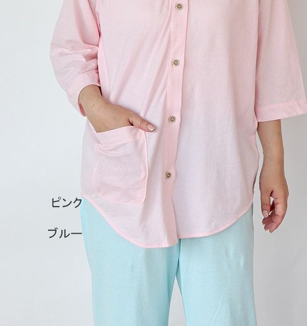 やわらか天竺ニットレディースパジャマ 上下セット・長袖/前開き/襟なし/七分丈