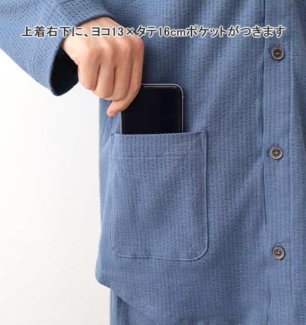 綿100%で素肌にやさしいコットンワッフルニットメンズパジャマの上着単品が登場です!ぽこぽことした生地表面に空気層を作って程よい保温性を実現、編み物だから伸縮性もあって快適な着心地に!シャツのようなシンプルな見た目で部屋着にもおすすめです!