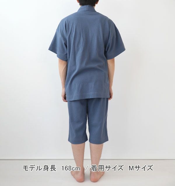ポコポコした生地表面でべたつかずに柔らかいニットサッカー素材のメンズの七分袖パジャマの上着単品です!涼しく関節を冷やさず快適に夏をお過ごしいただけます。軽くてリラックス感たっぷりの素材です。