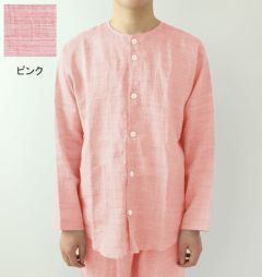 襟なしですっきりなノーカラーパジャマ。前開きタイプだから、羽織りとしても使えて便利!冷房の効いた部屋では、半袖だと少し肌寒いという方にピッタリの長袖長ズボン仕様。生地はシャリ感たっぷりの近江ちぢみ麻を使用しているので、汗をかいてもべたつきにくくひんやりと涼しいノーカラーパジャマです。