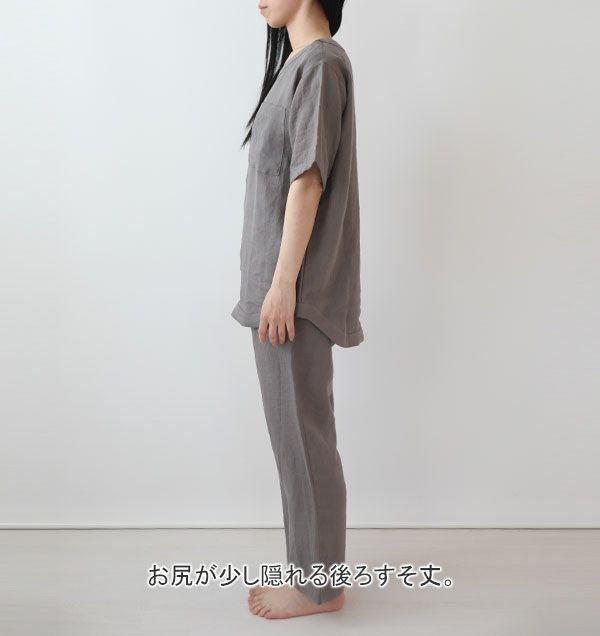 一般的な生地は色をぶれさせないため、漂白済みの「晒(さらし)」の生地を染めて、ムラのない均一な色を出します。一方こちらのリネンパジャマは、漂白前の生成(きなり)の上から染めることで、自然の草木染めのようなゆらぎのある、穏やかで深い色に仕上げています。