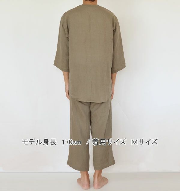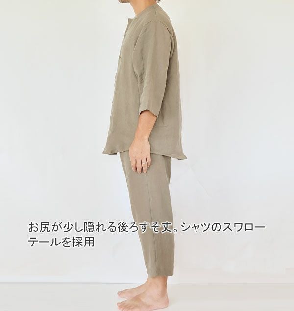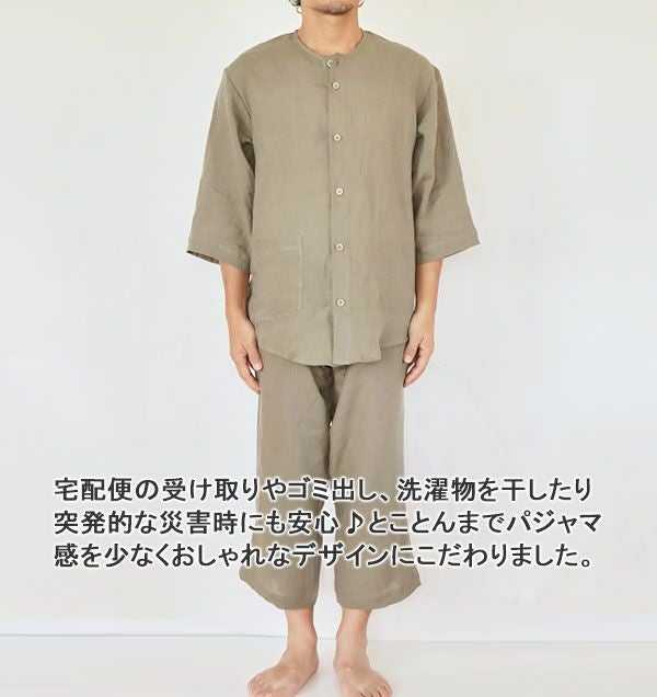 肘、膝を冷やしすぎない七分丈 フランスリネンで優雅な夏を やわらかるいリネンメンズパジャマ 上下セット・七分袖/前開き/襟なし/七分丈ズボン 【オーダーメイド】