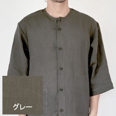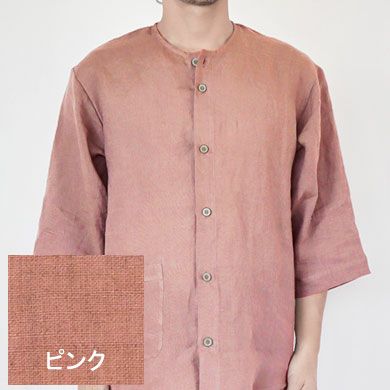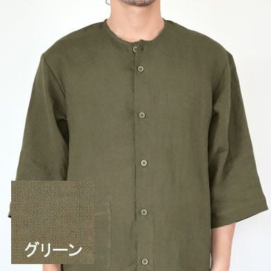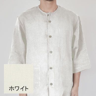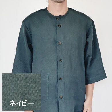 夏に最適、柔らかく軽いリネンの襟なしパジャマ。メンズXS~12L。七分袖タイプで涼しく過ごしたいけど冷やしたくない方におすすめです。クールクラッシュという洗いざらし加工で、麻とは思えない柔らかさ!他の麻と比べ30%も軽い!