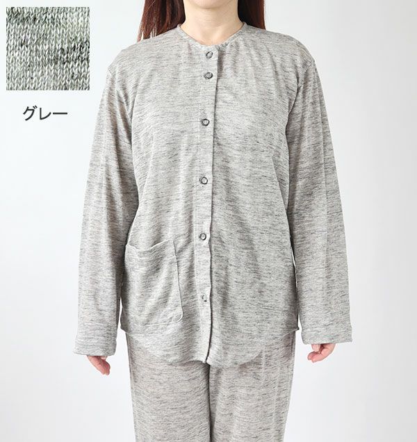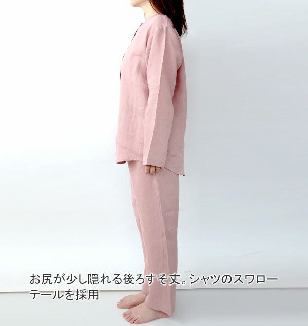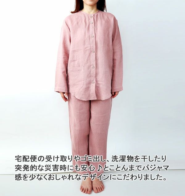 60先染めフランスリネンレディースパジャマ上下セット・長袖/前開き/襟なし