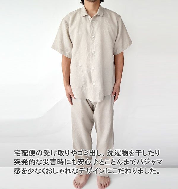 夏に最適、柔らかく軽いリネンの襟ありパジャマ。メンズXS~5L。半袖なので、暑がりな方におすすめです。クールクラッシュという洗いざらし加工で、麻とは思えない柔らかさ!細い60番手糸使用で、 他の麻と比べ30%も軽く、抜群の涼感です。