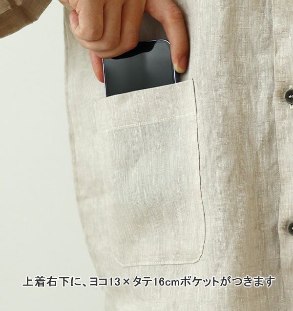 夏に最適、柔らかく軽いリネンの襟なしパジャマ上着単品。レディースXS~5L。長袖なので、クーラーの部屋でお休みの方におすすめです。クールクラッシュという洗いざらし加工で、麻とは思えない柔らかさ!細い60番手糸使用で、 他の麻と比べ30%も軽い!