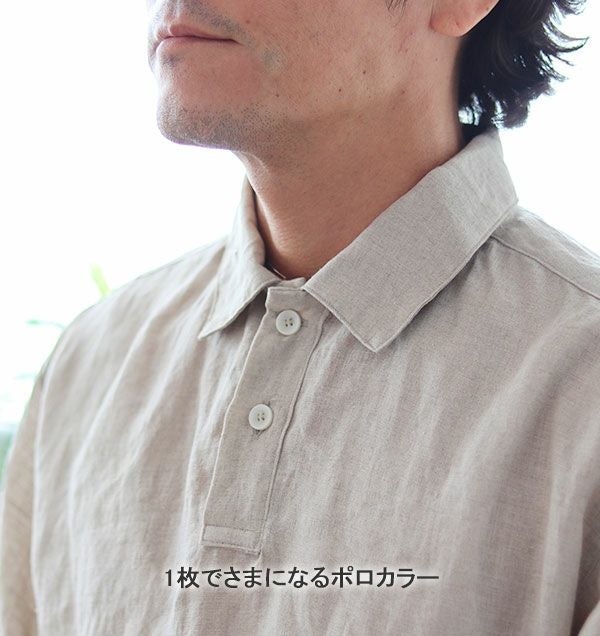 洗い加工のフランスリネンで優雅な夏を やわらかるいリネンメンズパジャマ上着単品・半袖/かぶり/ポロカラー 【オーダーメイド】