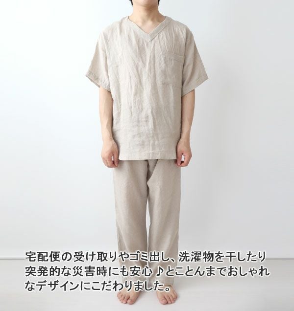 洗い加工のフランスリネンで優雅な夏を やわらかるいリネンメンズパジャマ上着単品・半袖/かぶり/Vネック 【オーダーメイド】