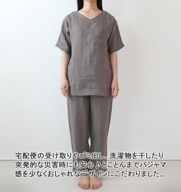 リラックス感があり涼しいリネン100%の天竺ニットのレディースパジャマ上着です!半袖Vネックデザインで風通しがよく快適で見た目もルームウェアのようで、お好みのズボンと合わせてコーディネートもお楽しみいただけます!