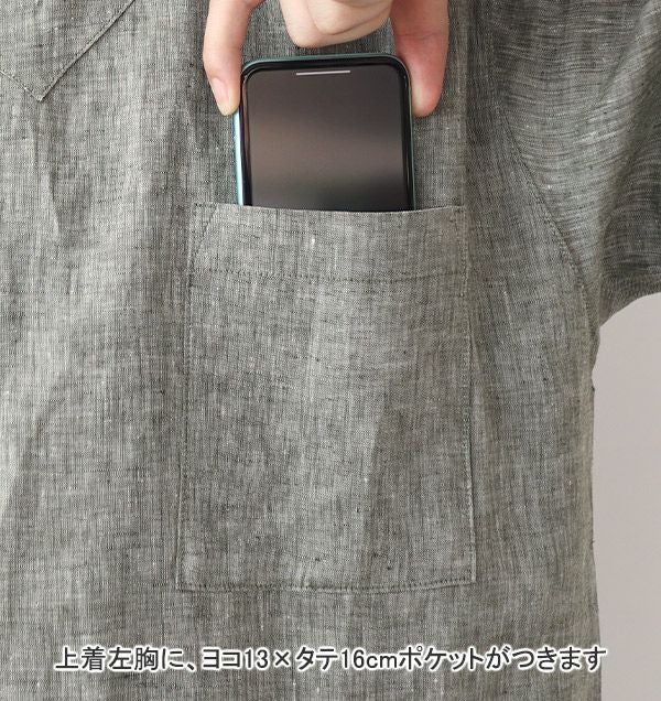 60先染めフランスリネンレディースパジャマ上下セット・長袖/前開き/襟なし