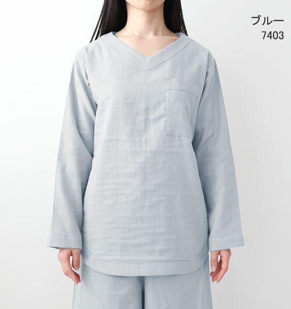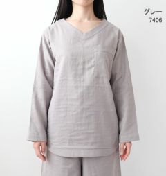 40オーガニックコットンダブルガーゼレディースパジャマ上下セット・長袖/かぶり/Vネック/ガウチョパンツ/八分丈