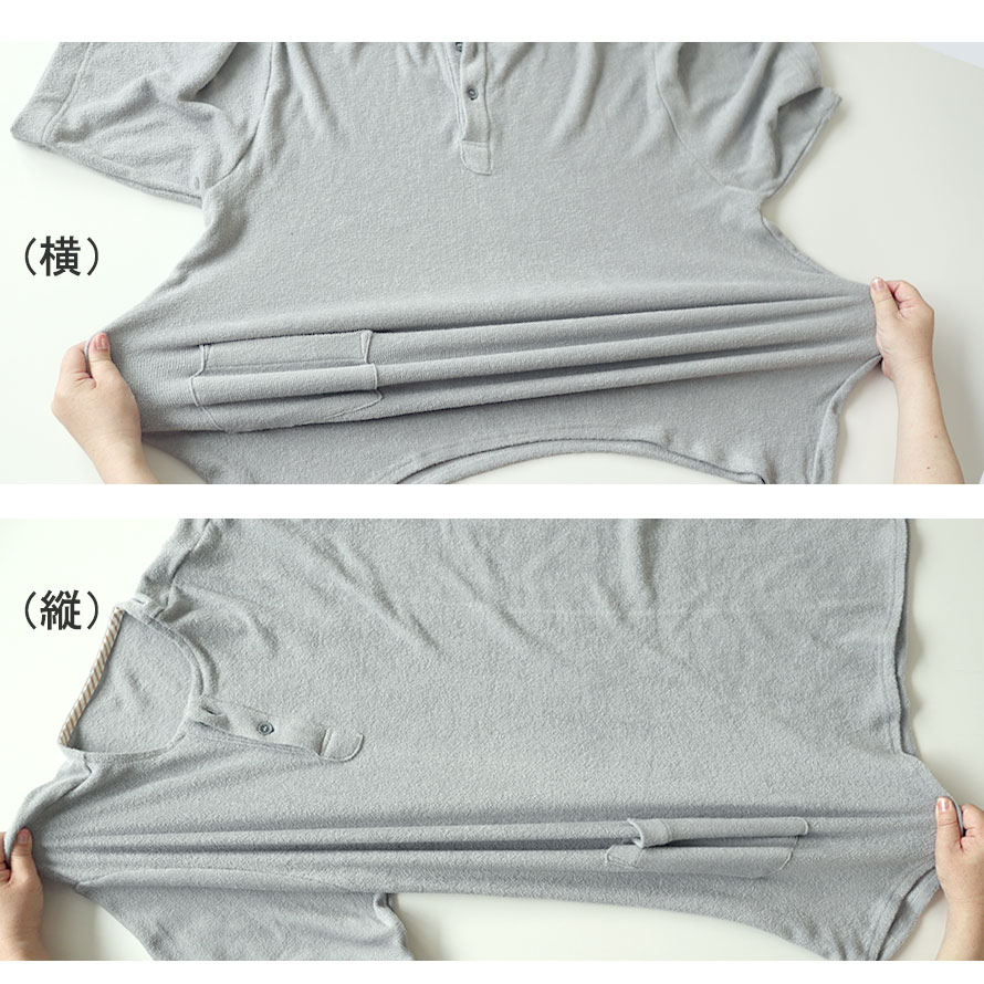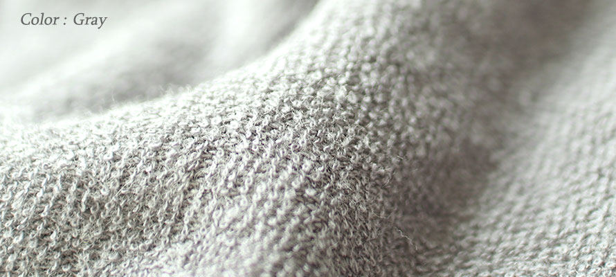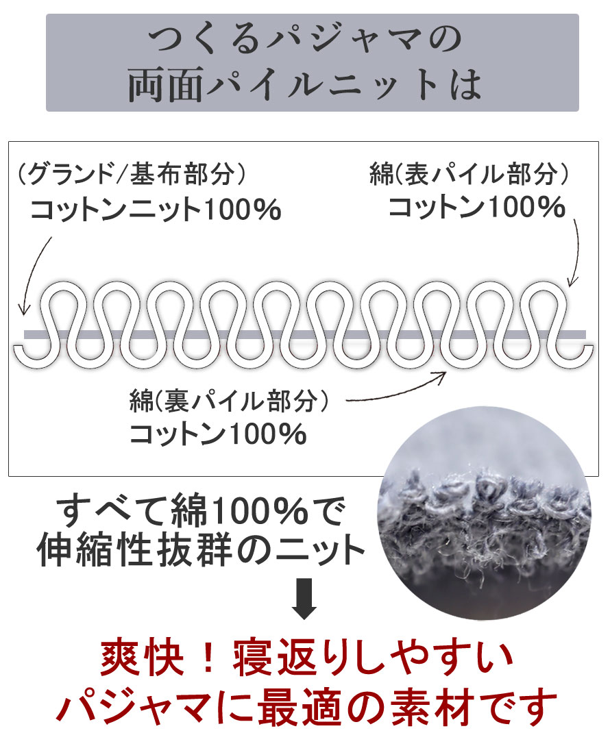 パイル地、タオル地といっても実はたくさんの種類がありますが、パジャマにとって必要なこと、「吸放湿性があること」「寝返りがしやすいこと」「肌触りが良いこと」を追及するとこの両面パイルニットにいきつきました!日本に1社しか持っていない機械で1日に約100mほどしか作れない大変希少なパイルでつくったパジャマ、ルームウェアです。