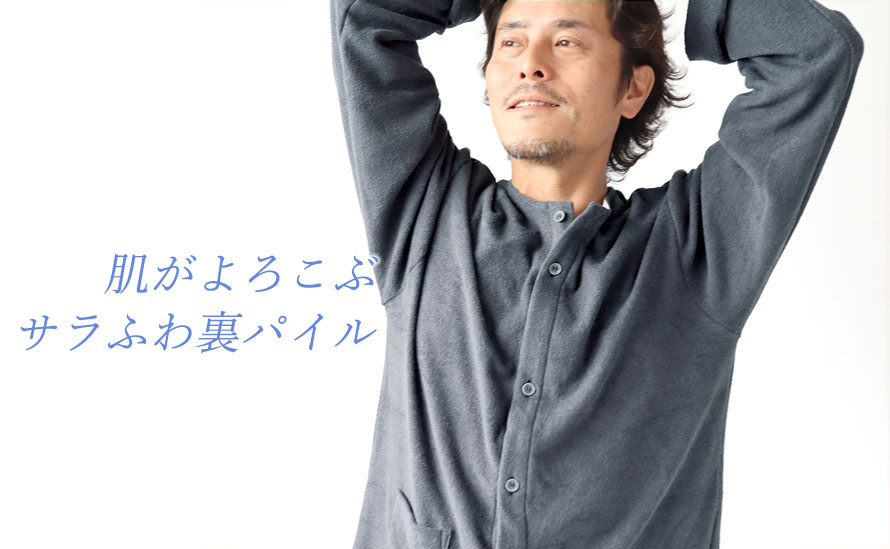 両面パイルニットメンズパジャマ 上下セット・長袖/前開き/襟なし