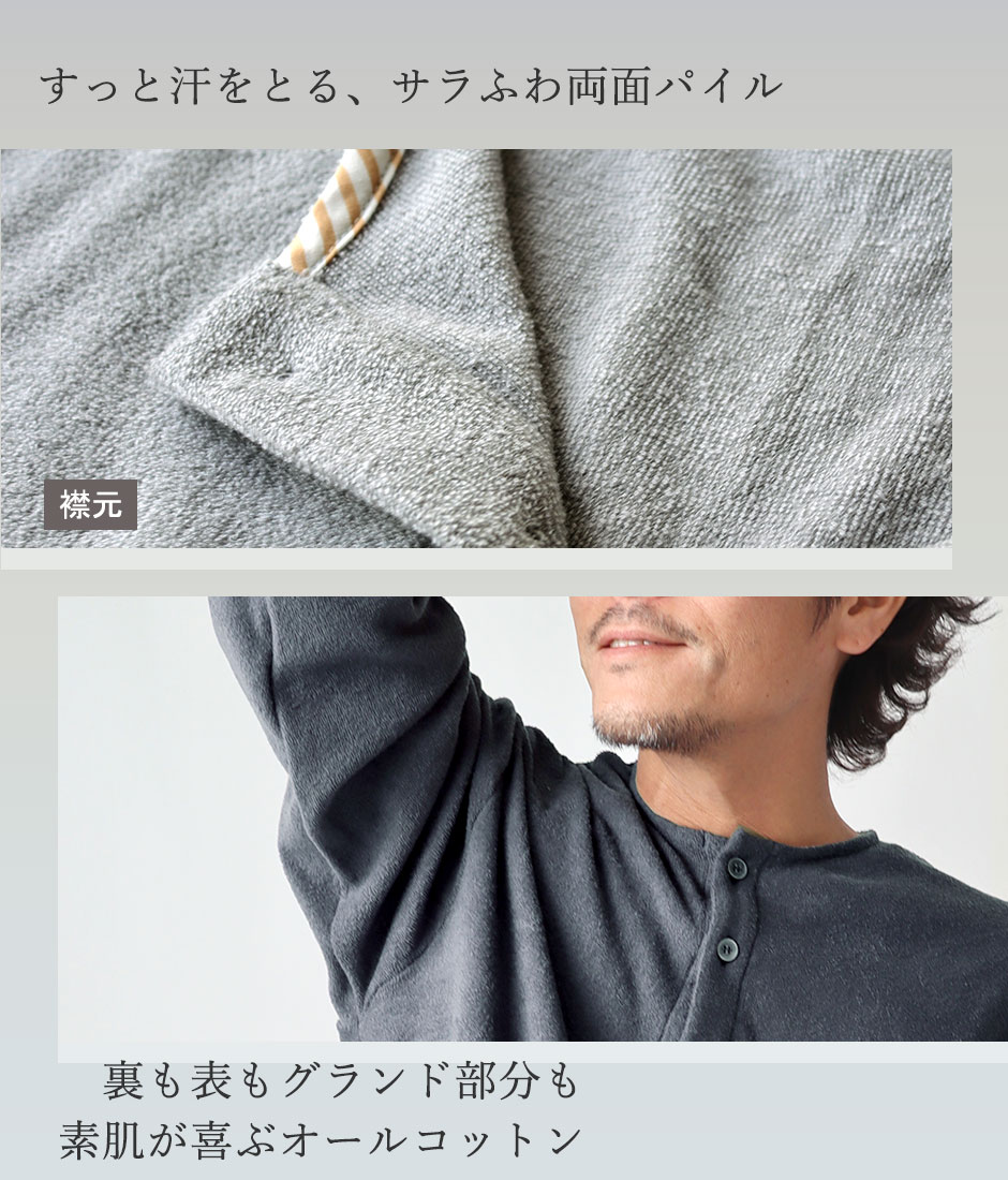 両面パイルだから汗ばむ季節も安心♪ 綿パイルが肌に直接あたるので、まるでタオルのように汗もよく吸ってくれて気持ちいい!伸縮性のある編み物のニットパイルの場合、おもて面がパイルでも肌に当たる方はツルっとしたものがほとんど。パジャマだからこそ肌にあたる裏面が大切です。タオルのようにふわふわしたパイル地ではなく、短めのミニパイルなので、柔らかいけどサラサラした肌触りでべたつきません。