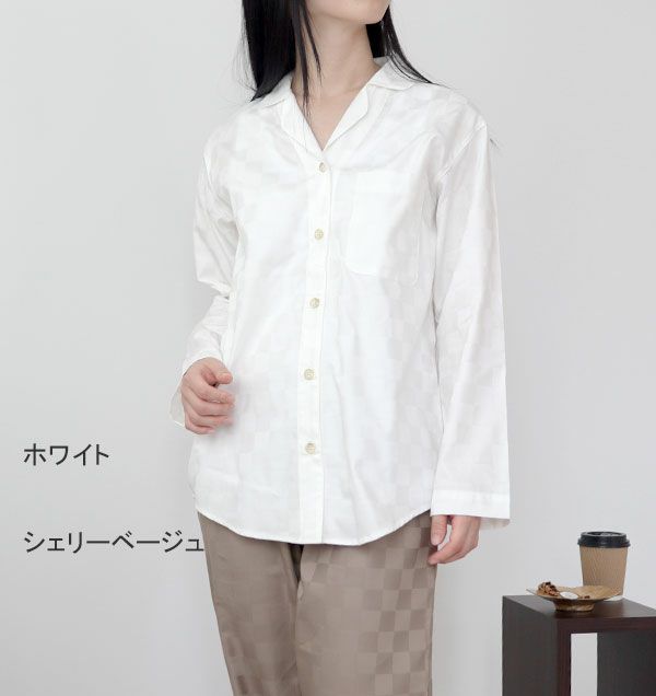 抜け感がありおしゃれな開襟パジャマも、ブロックチェックサテンと合わせることで高級感があり上品な印象に。滑らかな肌ざわりと首回りが開いたデザインで、一日中快適にお過ごしいただけます。