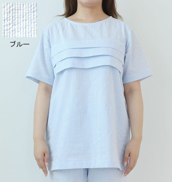 ポコポコ感でベタつかない!涼しい爽やかな夏 先染めサッカーストライプレディースパジャマ上下セット・半袖/かぶり/短パン/ラウンドネック 【オーダーメイド】