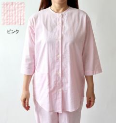 まるでシャツのようなストライプ柄。ズボンだけかえればゴミ出しはもちろん外出にも着ていけそうです!七分袖の涼しい夏のルームウェアとしても