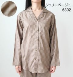 ブロックチェックサテンレディースパジャマ 上下セット・長袖/前開き/襟なし