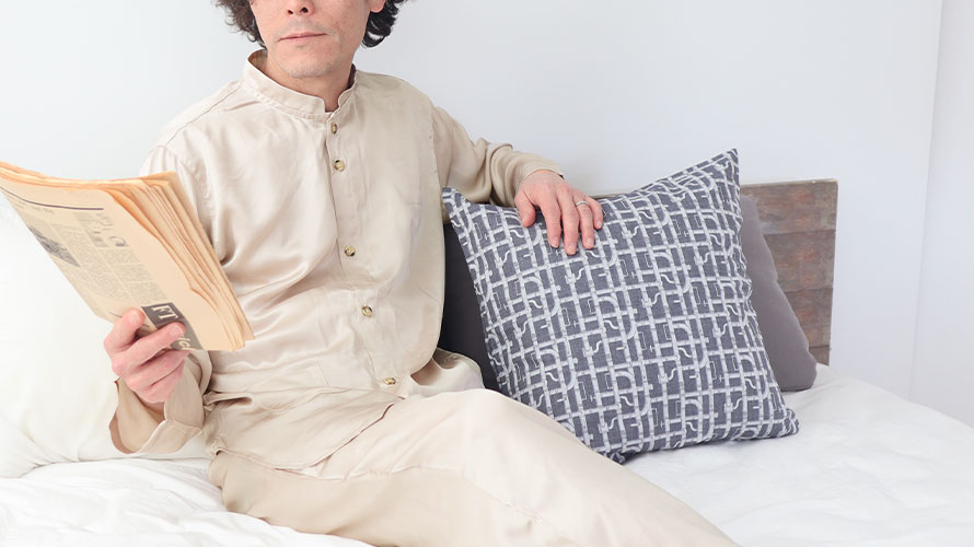 つくるパジャマでは、快眠に最適なコットン、リネン、シルクなどの天然素材のみを厳選し、さらに肌触りのよい生地にこだわっています。生地はほぼ全てオリジナルで、織りから、染め、仕上げ加工まで日本国内のものがほとんどです。直接、現地工場に足を運び、各分野のエキスパートに「こんなことできないか」と相談しながら生地を企画することもしばしば。とことん心地よい生地を追求しています。