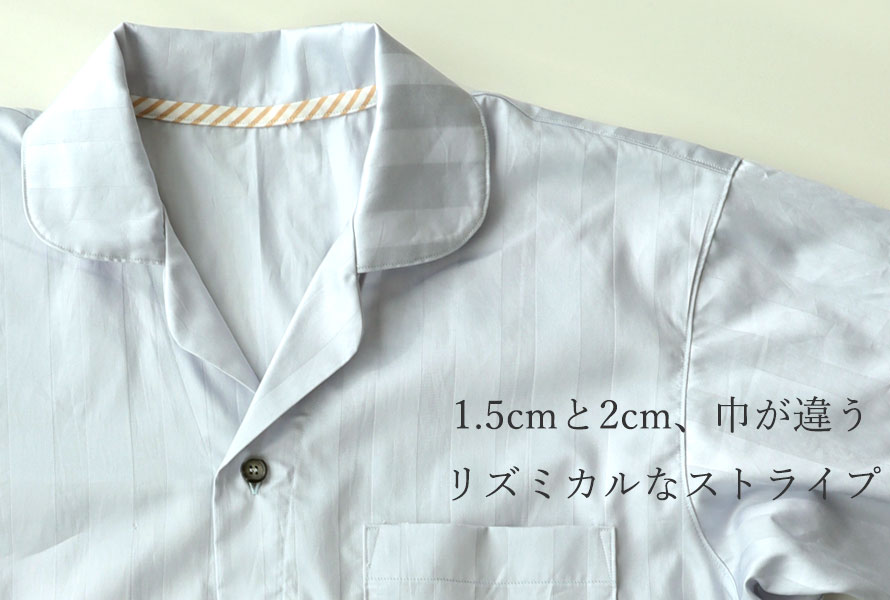 いろんなホテルでも採用されているサテンストライプ。ホテルに滞在しているようなラグジュアリーなひとときを。ズボンだけかえればゴミ出しはもちろん外出にも着ていけそうです!