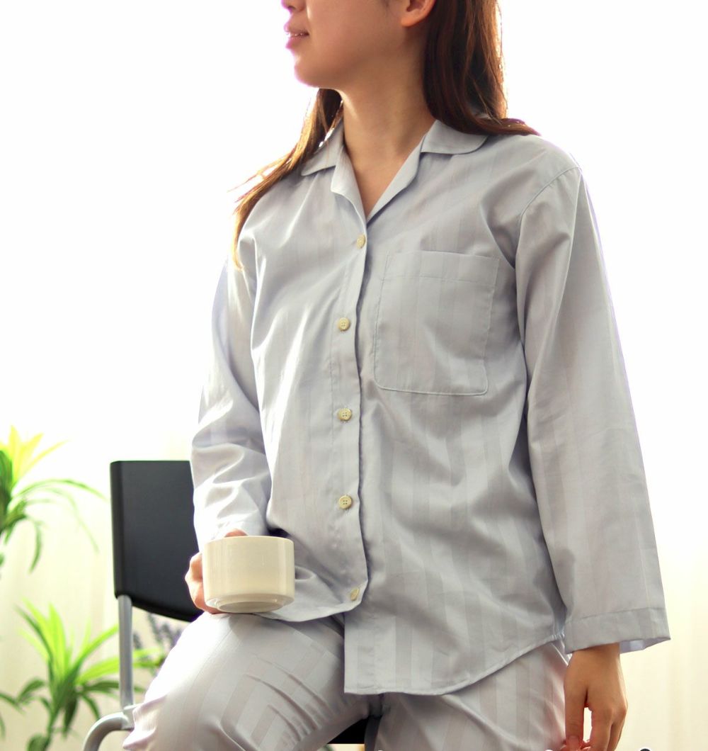 サテンストライプレディースパジャマ 上下セット・長袖/前開き/開襟