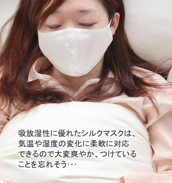 シルクは綿に比べて吸水性、吸湿性が1.5倍でより蒸れを感じにくい生地に仕上げています。さらに2枚のガーゼ間に空気層ができ、ほどよい保温性がありつつも、「生きた繊維」といわれるシルクは温度調整をしてくれます。保湿性に優れたシルクで寝ながらうるおいケア、朝起きるのが楽しみですね♪