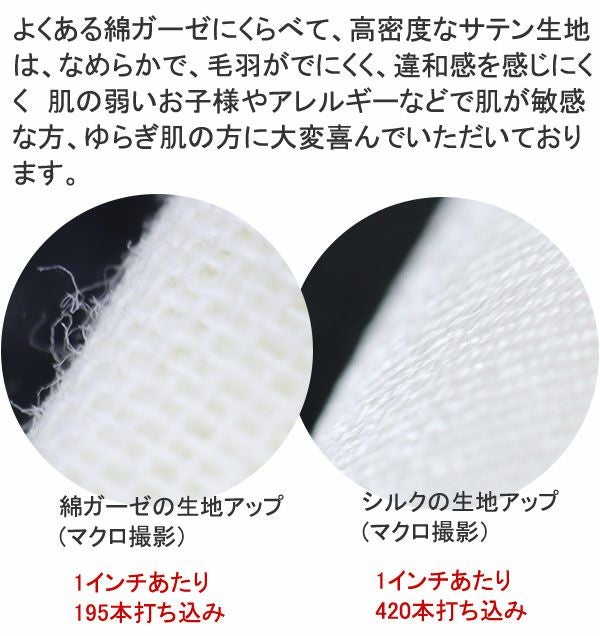 一般的なガーゼマスクは、拡大してみると微細な毛羽がでています。それが長時間お顔にあたると、かゆみなどの原因にも。改良版は裏も表もシルクサテンを使用し、毛羽がでにくく、ツルツルの肌触り。当店の一般的なガーゼでも1インチあたり195本ですが、シルクサテンは420本の打ち込みがあるのでとってもなめらか、肌に違和感が感じにくい生地なので、肌荒れしやすい季節の変わり目や不織布のマスクで肌が荒れて・・・とお悩みだったお客様、敏感肌の方にも喜んで頂いております。