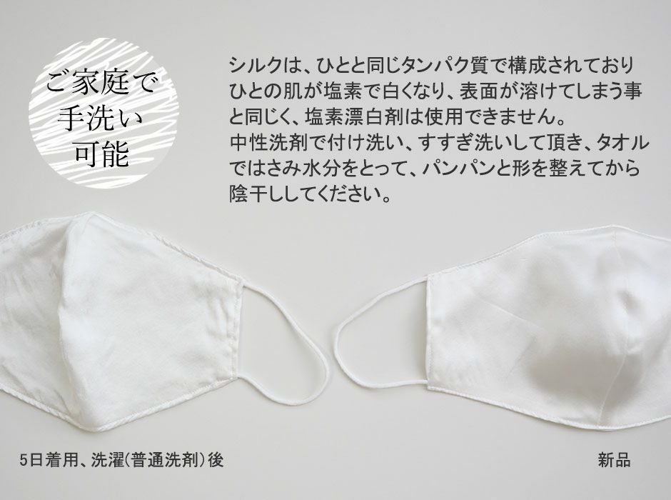 お洗濯後のシルクマスクです。サテン生地ですので、お洗濯すると多少シワになりますが端を伸ばすように形を整えて陰干ししてください。2月からスタッフも使用しておりますが、アイロンをかけず使用しております。除菌に関しましては、シルクの性質上、塩素系漂白剤はご使用頂けません。除菌をする場合は、次亜塩素ナトリウムやエタノールなどの除菌剤スプレーなどがおすすめです。