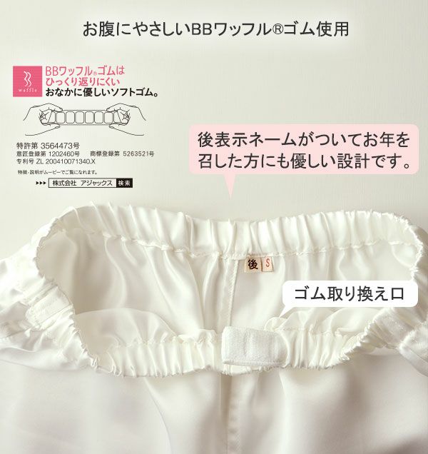就寝中は締め付け感が少なくお腹にあたる部分もやさしい感触のものがおすすめです。当店で使用しているBBワッフル®ゴムは、ずれにくいのにきつすぎない、パジャマに最適なお腹にやさしいソフトゴムです。
