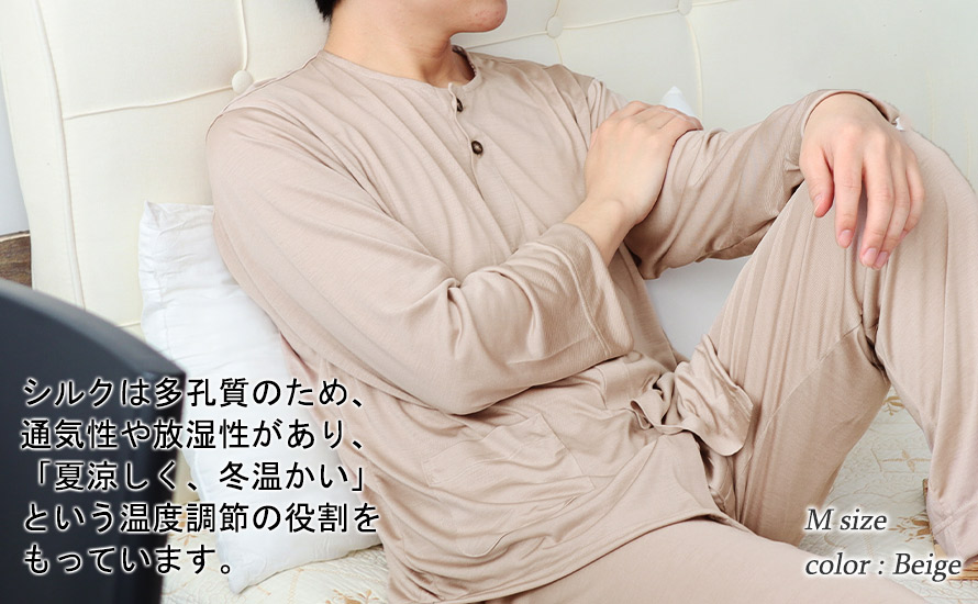 綿に比べて吸水性、吸湿性が1.5倍でより蒸れを感じにくく、ほどよい保温性があります。また「生きた繊維」といわれるシルクは多孔質のため、「夏涼しく、冬温かい」という温度調整をしてくれて一年中快適なシルクニットパジャマです。
