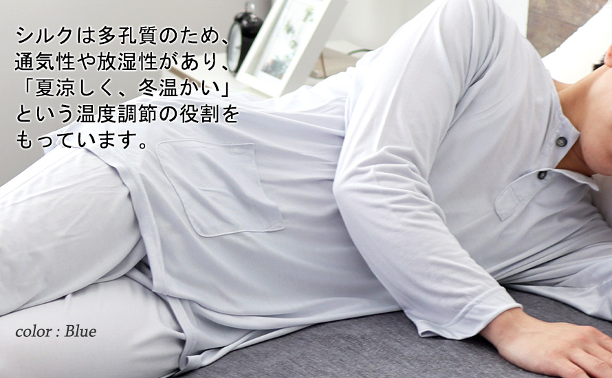 綿に比べて吸水性、吸湿性が1.5倍でより蒸れを感じにくく、ほどよい保温性があります。また「生きた繊維」といわれるシルクは多孔質のため、「夏涼しく、冬温かい」という温度調整をしてくれて一年中快適なシルクニットパジャマです。