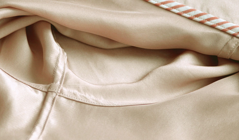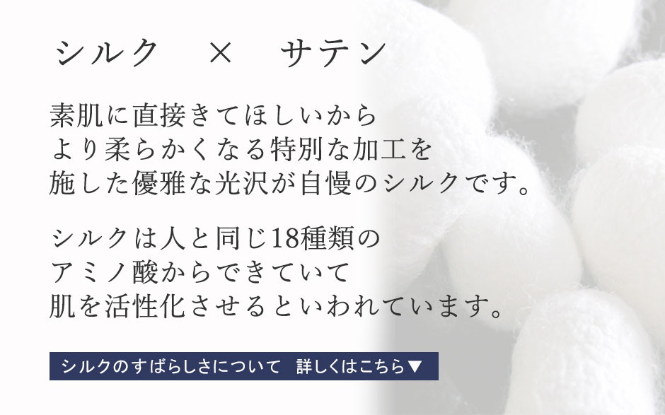 生地は糸が細くなるほど、柔らかく、つるっと滑らかな肌触りになります。このシルクはタテ42デニール、ヨコ84デニールという、一般的な綿生地の2倍以上の極細糸でサテン織りをしているため、「これぞシルク!」という極上のつるつるすべすべの肌触りです。