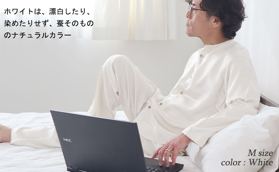 このシルクは19匁で、一般的な綿のパジャマの約30%も軽く、なおかつ耐久性も良いというバランスのよい生地です。