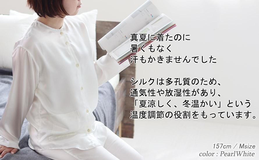 シルクは多孔質のため「夏涼しく、冬温かい」という温度調節の役割をもっています。綿に比べて吸水性、吸湿性が1.5倍でより蒸れを感じにくく、ほどよい保温性がありつつも、温度調整をしてくれるため、夏涼しく、冬温かい、一年中快適なノーカラーパジャマとなっています。