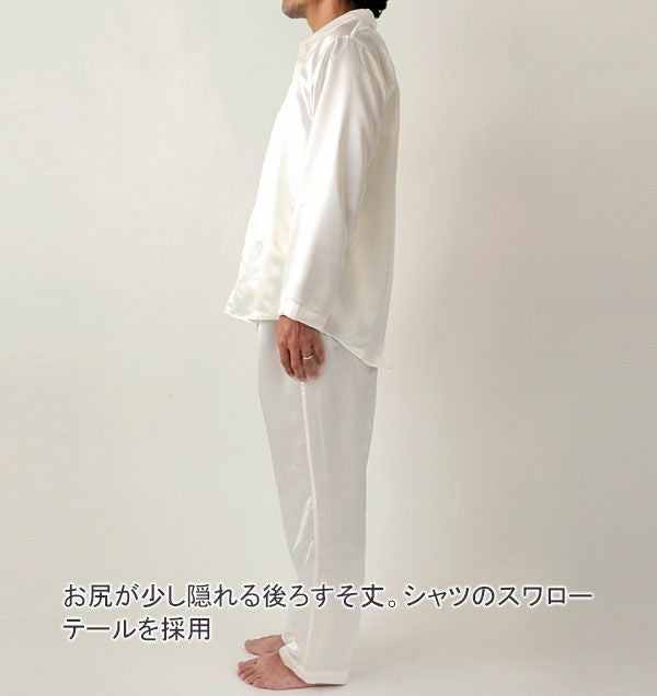 シルクは多孔質のため「夏涼しく、冬温かい」という温度調節の役割をもっています。綿に比べて吸水性、吸湿性が1.5倍でより蒸れを感じにくく、ほどよい保温性がありつつも、温度調整をしてくれるため、夏涼しく、冬温かい、一年中快適なスモールカラーパジャマとなっています。