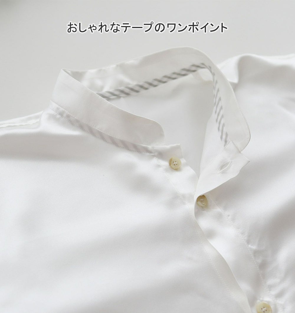 国産の川俣シルクサテンの美しいドレープ性。おしゃれなバンドカラーのデザインは ちょっとそこまで、上着を羽織って朝のパンを買いにいったり、ごみを出したり、外出を可能にしました。ボタンをはずしただけで全く違う印象に。